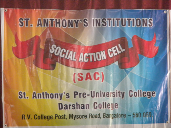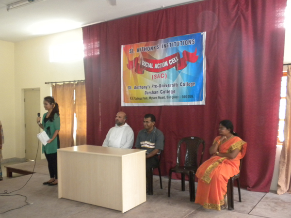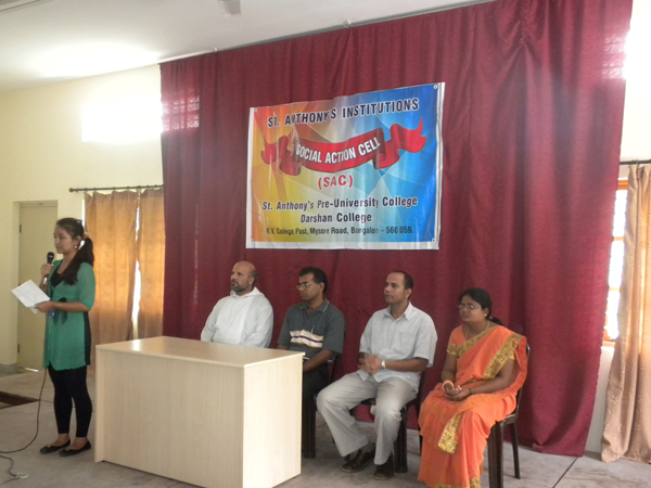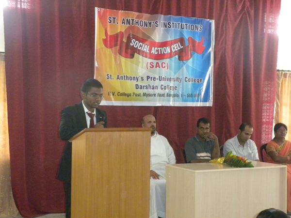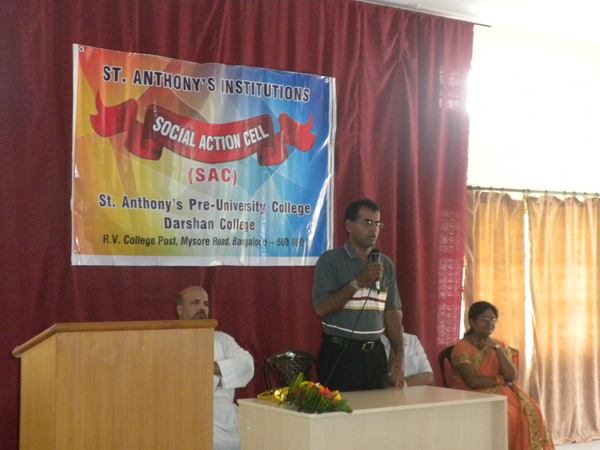 With the motive of creating social awareness and to respond to the needs of the humanity, Social Action Cell was inaugurated at St. Anthony’s Pre-University College and Darshan College on 18th July, 2011. Fr. Vinod Mascarenhas, the Director of Vimukti, the Social Action wing of the Holy Trinity Province, Karnataka inaugurated the Cell and spoke on the need of being other-centered in life. He also stressed on the importance of raising one’s voice against injustices taking place in our society. The programme began with a Prayer Song by Ms. Felcita D’Souza and group. The director Fr. Chetan Lobo, welcomed the chief guest Fr. Vinod and handed over a bouquet. The College President Mr. Albin Francis introduced the chief guest to the audience. The degree principal Fr. Veerus, PU principal Ms. Rashmi Swamy and the lecturer co-ordinator for social action Ms. Suchitra were on the dais. Ms. Cecilia of PU compered the programme.